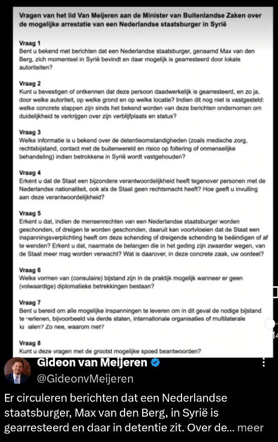 Gideon van Meijeren stelde op 17 februari spoed-Kamervragen over bericht dat "fakkeldrager" Max van den Berg is gearresteerd in Syrië