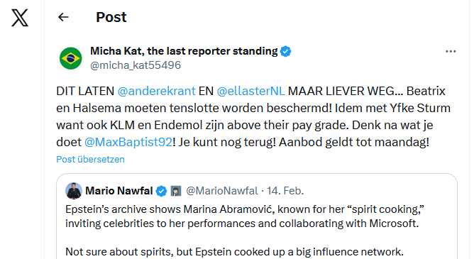 Micha Kat twitterde op 14 februari 2026 het volgende: