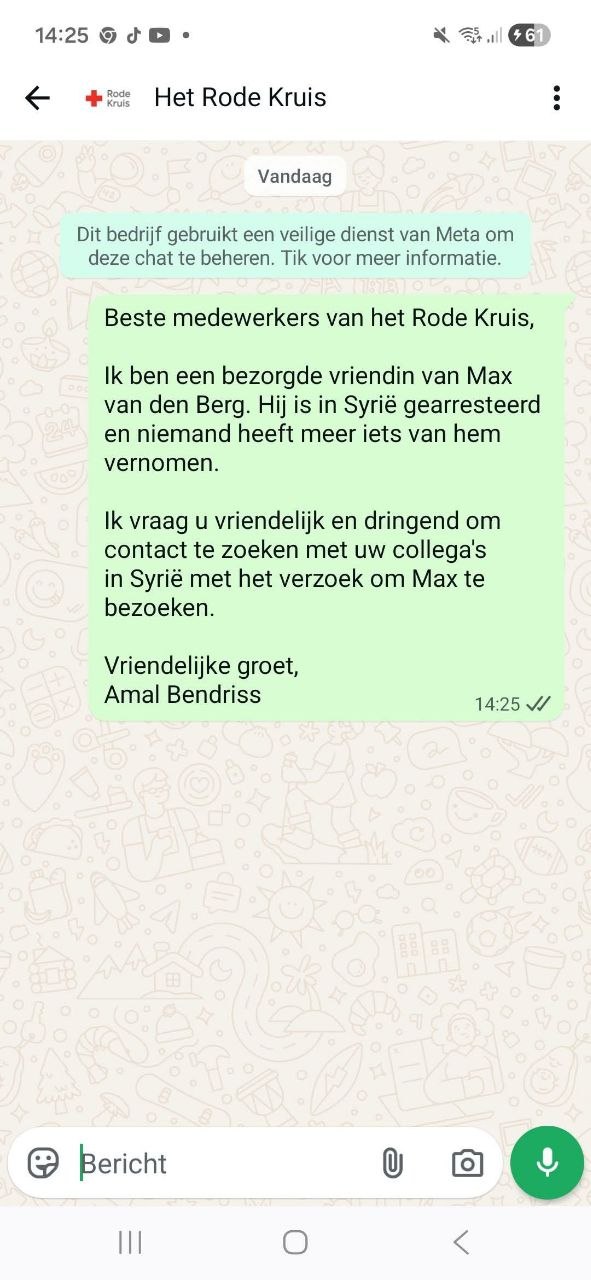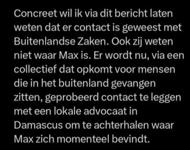 Hij acht het verhaal 'wel waarschijnlijk', geeft hij vervolgens aan. "Op zijn reis door Syrië heeft Max het in berichten op sociale media nadrukkelijk opgenomen voor de Koerden. We zijn een beetje bang dat hij daarmee de aandacht van de Syrische overgangsregering op zich gevestigd heeft. Het zou zomaar kunnen dat ze hem daarom opgepakt hebben."
