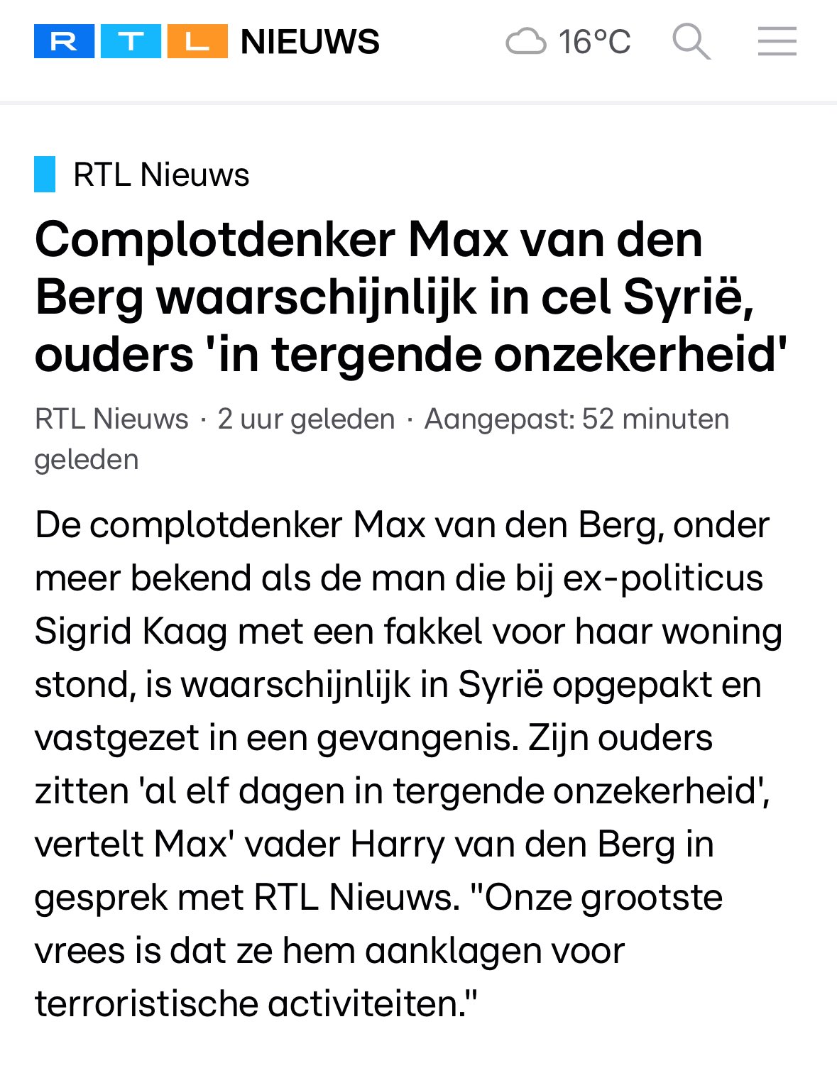 De complotdenker Max van den Berg, onder meer bekend als de man die bij ex-politicus Sigrid Kaag met een fakkel voor haar woning stond, is waarschijnlijk in Syrië opgepakt en vastgezet in een gevangenis. Zijn ouders zitten 'al elf dagen in tergende onzekerheid', vertelt Max' vader Harry van den Berg in gesprek met RTL Nieuws. "Onze grootste vrees is dat ze hem aanklagen voor terroristische activiteiten."