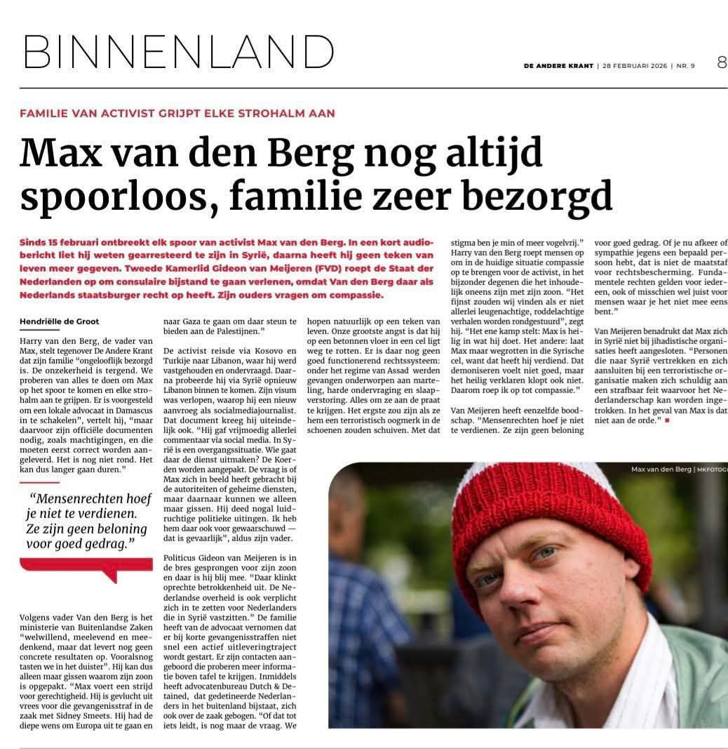 Er circuleren berichten dat een Nederlandse staatsburger, Max van den Berg, in Syrië is gearresteerd en daar in detentie zit. Over de feiten en omstandigheden bestaat op dit moment nog veel onduidelijkheid. Ik heb hierover spoedvragen gesteld aan de Minister van Buitenlandse Zaken en zal jullie op de hoogte houden! Max van den Berg is volgens de berichtgeving gearresteerd in Syrië. Zijn laatste bericht zou luidden: "Het hotel is omsingeld, ik word gearresteerd." Gideon heeft Max als vermist opgegeven bij de Nederlandse ambassade in Libanon. Dat moest daar, omdat de Nederlandse ambassade in Syrië gesloten is.