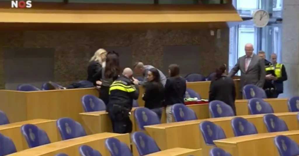 In de Tweede Kamer brak paniek uit nadat Hans Kamperman van de publieke tribune was gesprongen.