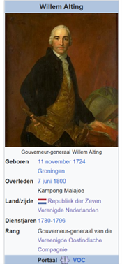Johan Christian Goldman, geboren 3 december 1765 in Dresden, Saksen, Heiliges Römisches Reich, kwam op 15 april 1785 met het schip Dordrecht aan in Nederlands-Indië, ten tijde dat Willem Alting (zie foto) (1780-1796, Groningen), aan de land/ zijde van de Republiek der Zeven Verenigde Nederlanden, gouverneur-generaal van de Vereenigde Oostindische Compagnie was voor het private bedrijf de Vereenigde Oostindische Compagnie (VOC) was.