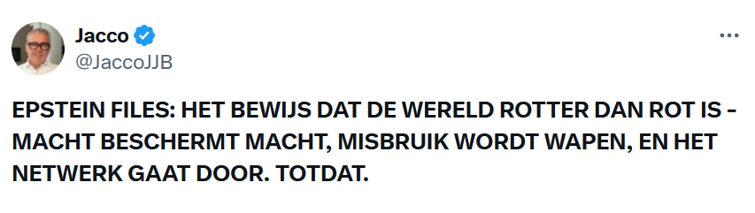 Niet omdat één document "alles bewijst", maar omdat de contouren zichtbaar worden van een systeem dat groter is dan één man. Epstein was geen incident. Hij was een knooppunt. Een schakel. Een instrument. En wie dacht dat zijn ontmanteling het einde was, komt bedrogen uit. Want dit soort netwerken verdwijnen niet omdat één figuur valt. Ze veranderen van vorm. Ze verplaatsen. Ze krijgen nieuwe namen, nieuwe routes, nieuwe beschermers. De ellende loopt door.