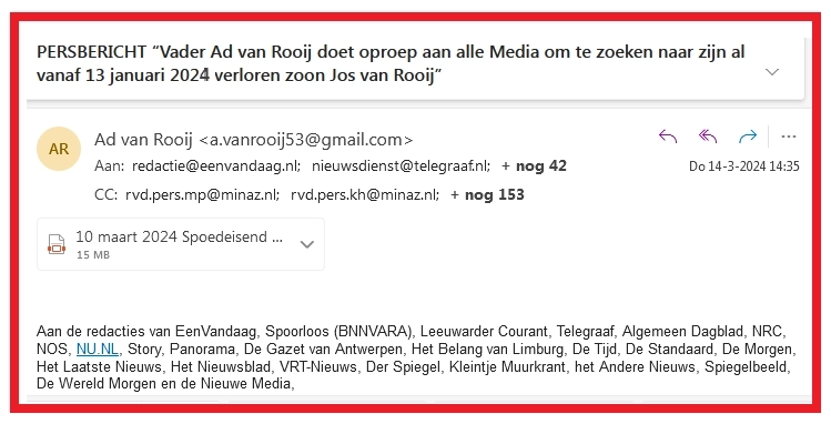 Ad van Rooij, die tot heden nog steeds niet weet waar zijn zoon Jos van Rooij is gebleven, zond onze redactie per e-mail op 14 maart 2024 een tweede PERSBERICHT toe.