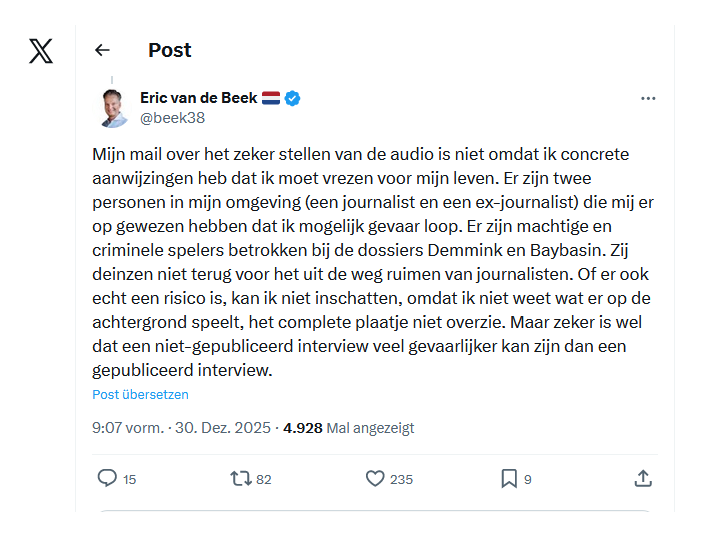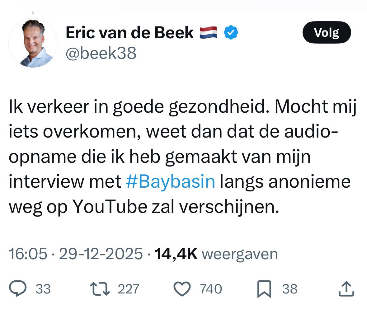 "Ik verkeer in goede gezondheid," laat Van de Beek op datzelfde medium weten. "Mocht mij iets overkomen, weet dan dat de audio-opname die ik heb gemaakt van mijn interview met Baybasin langs anonieme weg op YouTube zal verschijnen."
