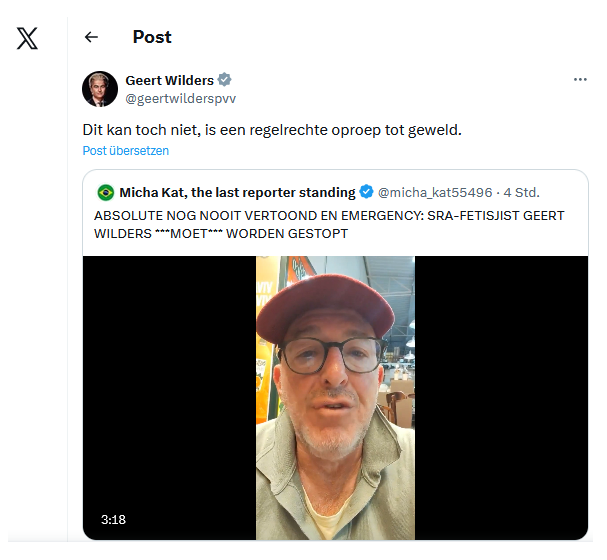 Lees de reactie van Geert Wilders (PVV) op Twitter naar aanleiding van de video van onderzoeksjournalist Micha Kat die de samenleving waarschuwt om het volk, de Nederlanders, te redden van het "Monster Wilders"!