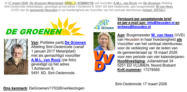 SOMMATIE van voorzitter Ad van Rooij van De Groenen, afdeling Meierijstad en Heusden, aan VVD-burgemeester Willemijn van Hees om NIETIG VERKLARING van de gemeenteraadsverkiezingen op 18 maart 2026.