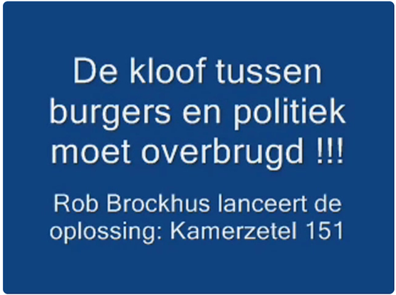 Het resultaat zal zijn dat de kloof tussen het parlement en bevolking gedicht kan worden met de actuele inbreng van volksvertegenwoordigers van de dag. Ik verwacht dat zowel het Vragenuurtje in de Tweede Kamer als het programma 'Kamerzetel 151' ® een hoge kijkdichtheid halen, omdat de bevolking zelf het programma creëert en het de pers de gelegenheid biedt om in te haken op dat wat in de Kamer en in het programma aan onderwerpen naar voren wordt gebracht.