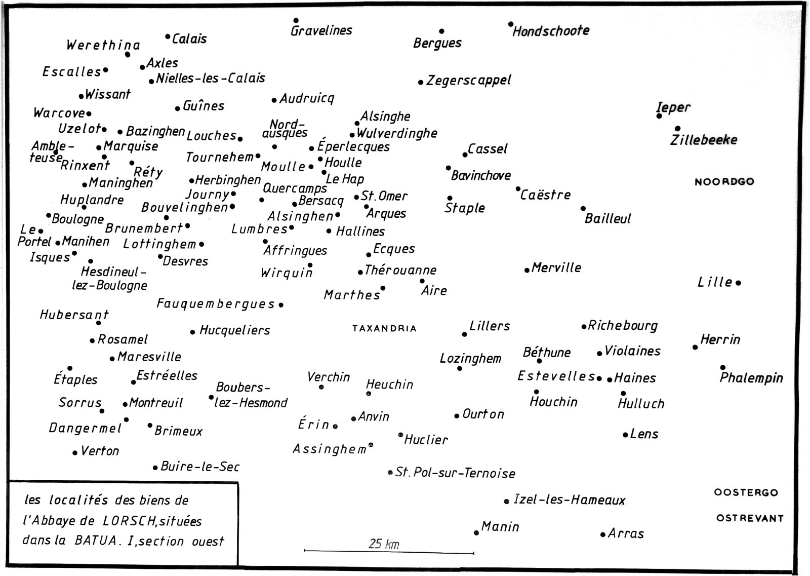 De abdij van Lorsch (klik hier voor meer info) had vele bezittingen in Taxandria. Er is geen enkele relatie bekend tussen de abdij van Lorsch en Brabant. Bij het enorme complex van Lorsch blijkt verschillende malen, dat dit lag op de scheiding van Batua en Taxandria. De teksten uit de Romeinse geografische bronnen maken duidelijk dat Taxandria een Frans landschap was. Het lag ten westen en noordwesten van Atrecht (Arras). Het werd ook Testerbant genoemd, dat identiek was met Westrachia, en was de tegenhanger van Ostrachia, waar de streeknaam Ostrevant nog bestaat. Het was het vroegere Austrebanti en het latere Karolingische Austrasië. In de oorkonden van Aefternacum - Eperlecques worden verschillende plaatsen in Taxandria genoemd.