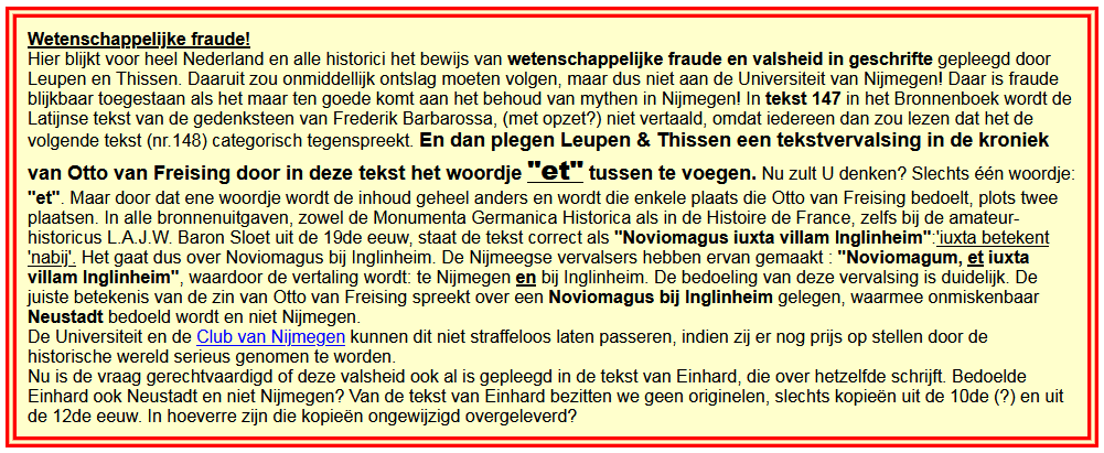 uitzondering) nu eens wel vertaald. Daarin lezen we ''Noviomagum et iuxta villam Inglinheim" (nageschreven van Einhard?). Hier wordt wetenschappelijke fraude gepleegd. Zie kader hieronder.
