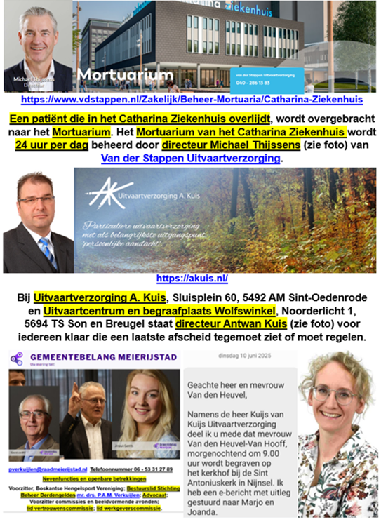 Hoe extreem ver dit WERELDWIJD MISDAAD-NETWERK onder aansturing van katvanger Antwan Kuis directeur Uitvaartverzorging A. Kuis, Sluisplein 60, 5492 AM Sint-Oedenrode (gemeente Meierijstad) en Uitvaartcentrum en begraafplaats Wolfswinkel, Noorderlicht 1, 5694 TS Son en Breugel (gemeente Son en Breugel) in samenspanning met betrokken in het Catharina Ziekenhuis gevestigde bedrijf Van der Stappen Uitvaartcentra (KvK 17100600), Michelangelolaan 2, 5623 EJ Eindhoven, met de hulp van betrokken burgemeesters Kees van Rooij (CDA) van Meierijstad en Jeroen Dijsselbloem (PvdA / GroenLinks) van Eindhoven, betrokken Rooms-Katholieke pastoor Bryan van de Mortel van Parochie Heilige Oda, Sint-Oedenrode, Son, Breugel en zijn betrokken advocaat Peter Verkuijlen van de lokale politieke partij Gemeentebelang Meierijstad (en zijn dochter Francine van Lanen-Verkuijlen) gaat kunt U hieronder lezen in de volgende artikelen op De Nieuwe Media en de door het Ecologisch Kennis Centrum B.V. geplaatste GESCHRIFTEN op De Nieuwe Media.