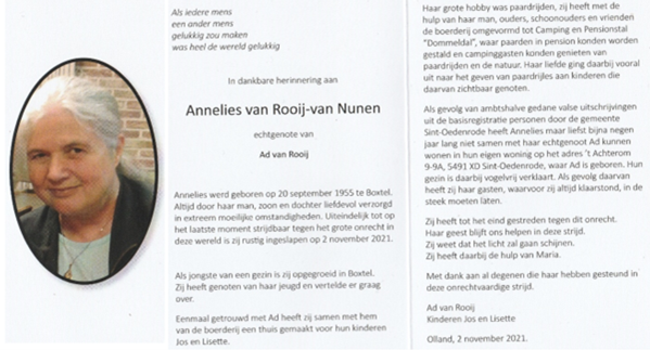 Moest daarom het gehele gezin van Rooms-katholiek gewijd acoliet A.M.L. (Ad) van Rooij worden uitgeroeid en zijn Rooms-katholieke vrouw J.E.M. (Annelies) van Rooij van Nunen op 9 november 2021 (ruim 5 jaar geleden) op het Rooms-Katholieke kerkhof van de Heilige Martinus in Olland levend worden begraven?, lees daarvoor het volgende artikel op De Nieuwe Media.