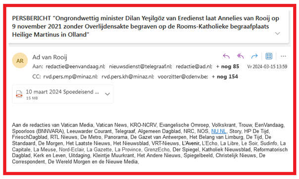 PERSBERICHT: "Ongrondwettig minister Dilan Yeşilgöz van Eredienst laat Annelies van Rooij op 9 november 2021 zonder Overlijdensakte begraven op de Rooms-Katholieke begraafplaats Heilige Martinus in Olland"