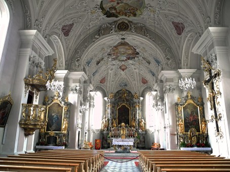 Daar precies tegenover aan de rechtermuur hing een al even fraai groot kruisbeeld waaraan Christus hing. En tussen die twee in, boven in het gewelf, was een plafondschildering zichtbaar van de hand van de beroemde frescoschilder Johann Georg Bergmüller, voorstellende een Engel die de toorn Gods laat neerdalen op al het menselijke addergebroed, de valse profeten, de decadente en corrupte geestelijken, de tollenaars en de Farizeeërs, de Moslims en de slang van Satan zelf. Zij werden allen in een bodemloze put gedreven door het zwaard en de bliksemschichten van de Engel des Wrake.