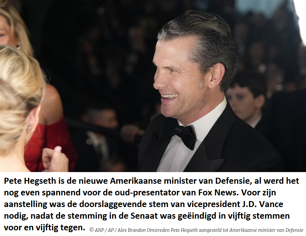 Bron en meer informatie: https://www.rtl.nl/nieuws/buitenland/artikel/5491204/omstreden-pete-hegseth-aangesteld-tot-amerikaanse-minister-van